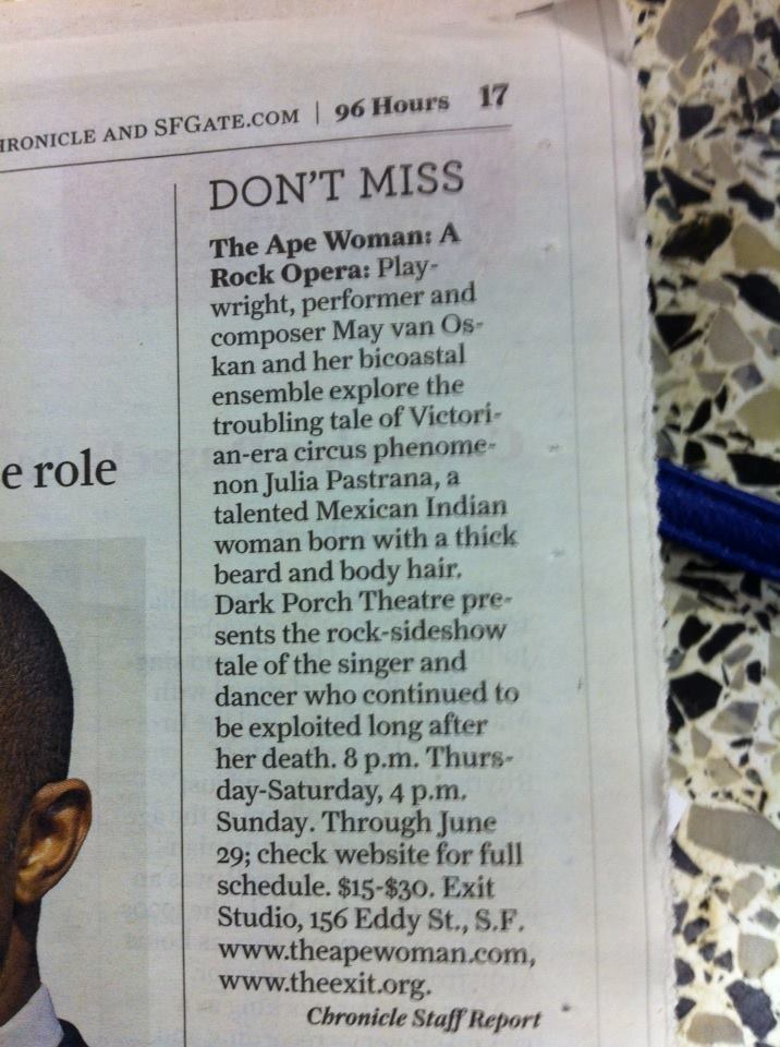 - The Martha’s Vineyard Times “Theater : ‘The Ape Woman’ a sold-out hit at The Pit Stop” by Tony Omer